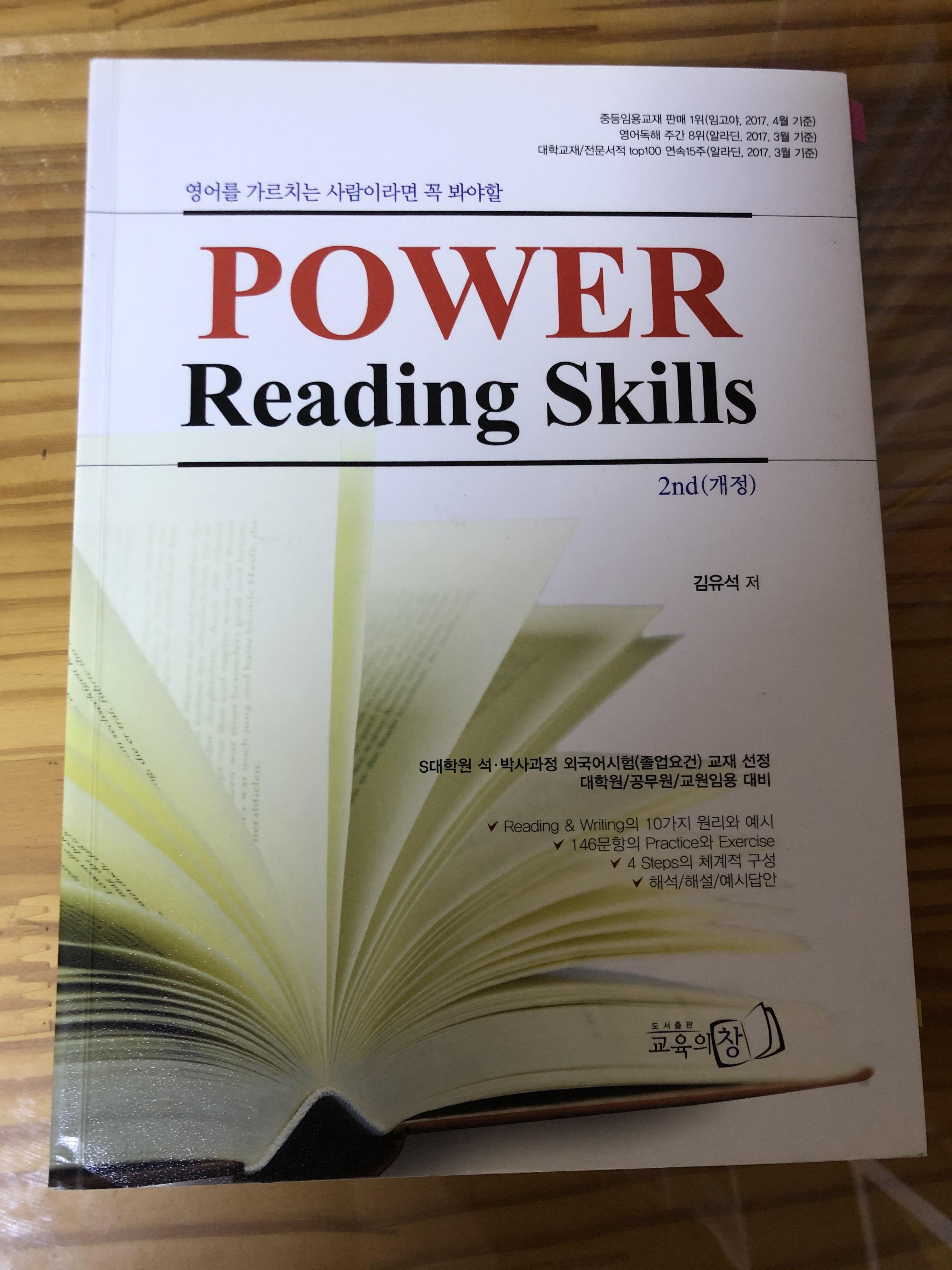 김유석 파워리딩스킬은 '영어를 가르치는 사람이라면 꼭 봐야할'이라는 부제가 붙은만큼 영어 독해 교육에 대해 전반적이고 필수적으로 알아야 할 주제, 키워드, 논리 등과 관련된 내용을 기출 지문과 함께 다루고 있어서 임용 일반영어 실력 향상에 도움이 많이 되는 책이라고 생각합니다 :)
