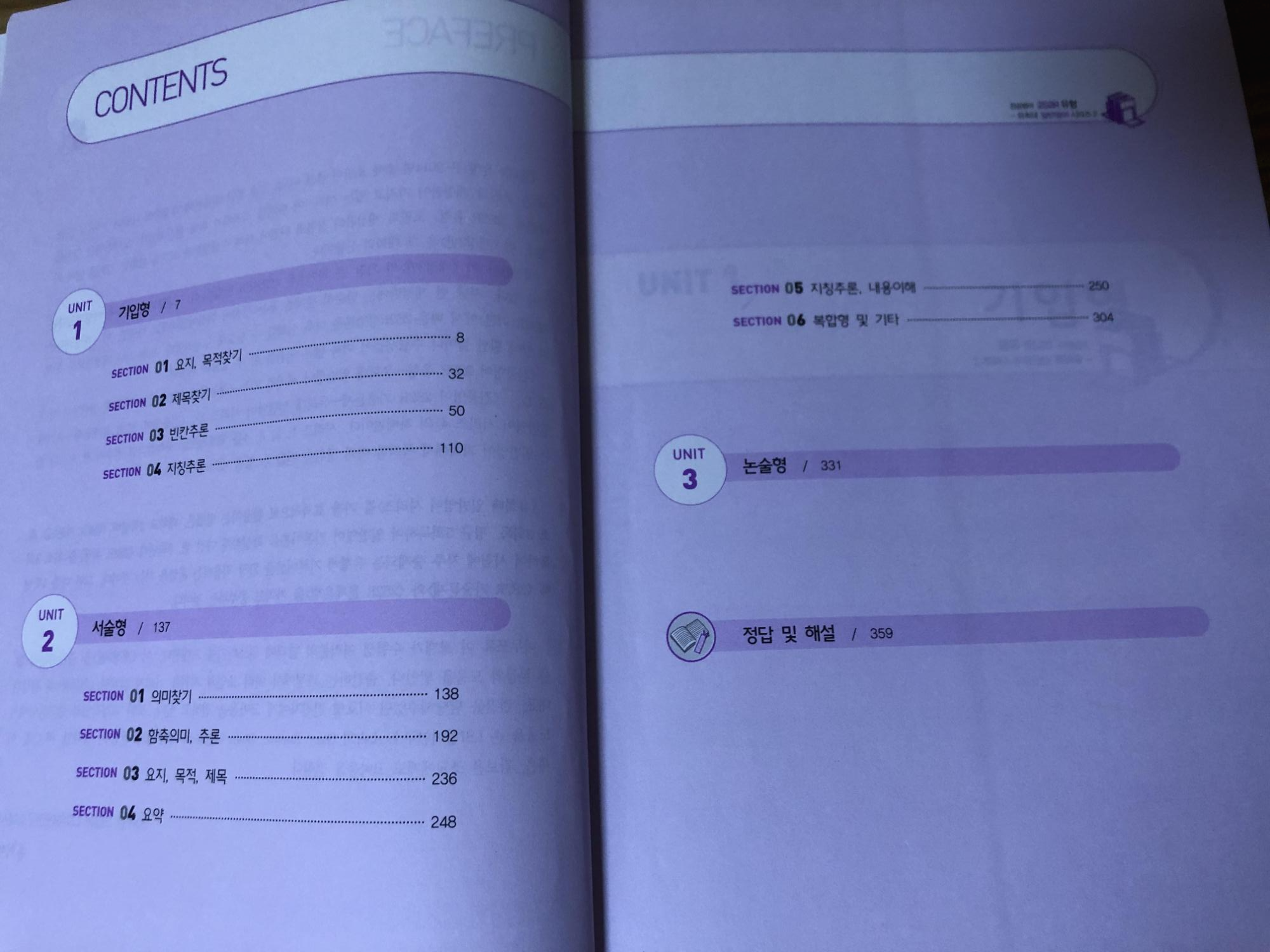 그리고 내용은 각 단원의 내용과 관련된 설명-연습문제-기출문제의 순으로 제공됩니다. 각 지문의 해설과 어휘정리는 맨 뒤페이지에 정리되어 있습니다.