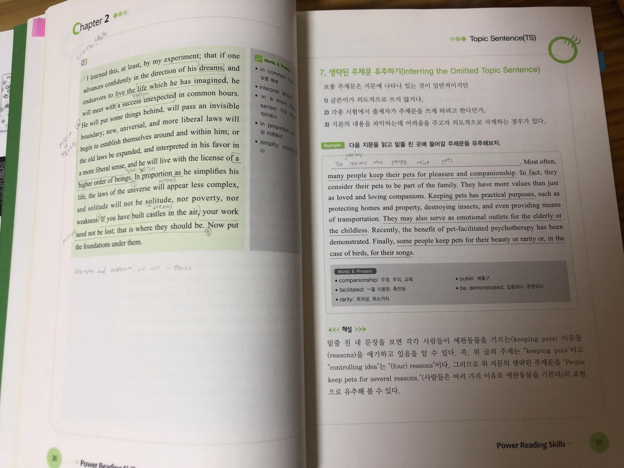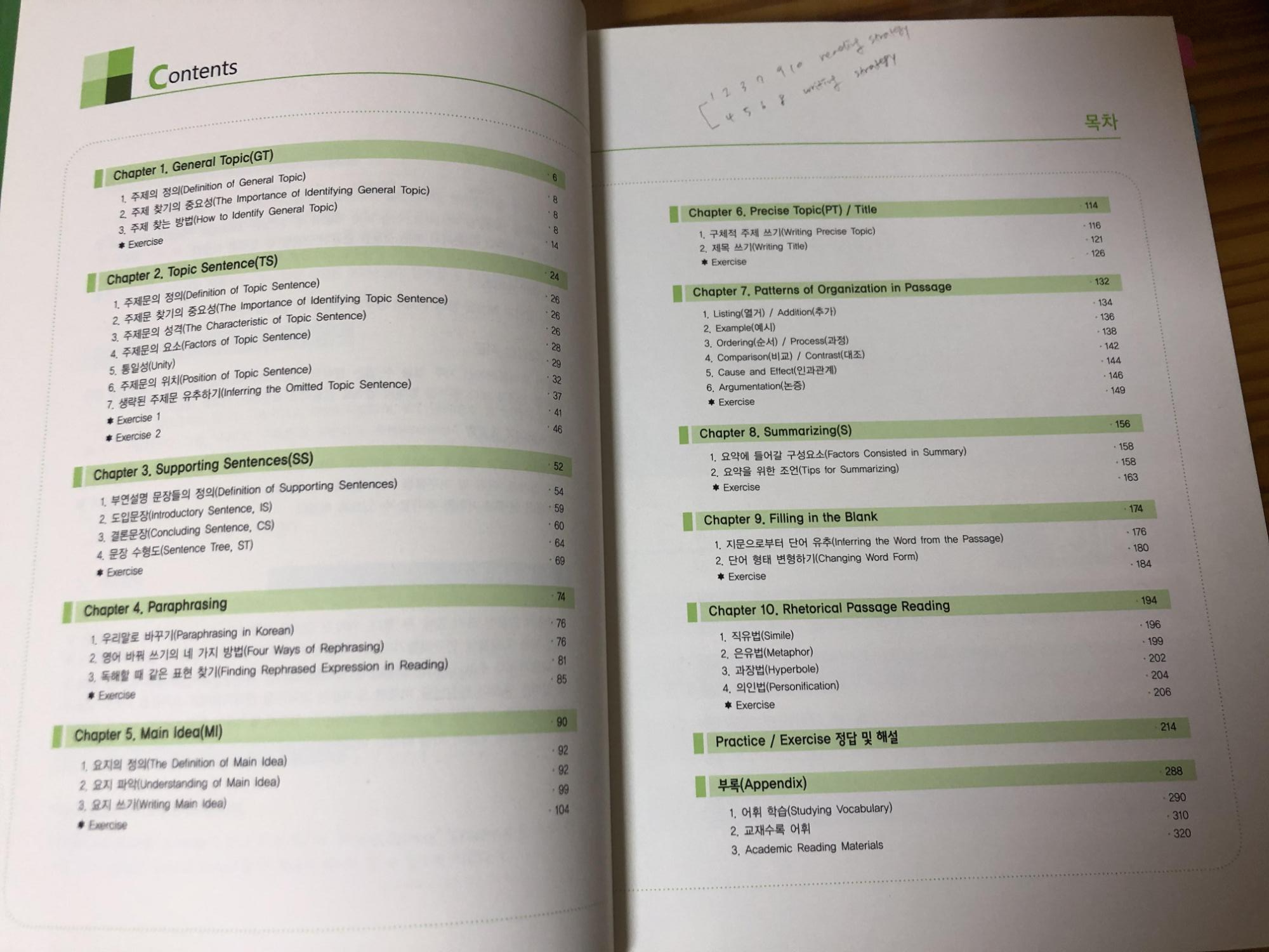 김유석 파워리딩스킬의 목차와 내용 예시입니다. 목차는 주제, 패러프레이징, 메인아이디어 등과 같이 독해를 할 때 기본적으로 이해해야할 내용을 기준으로 이루어져 있습니다.