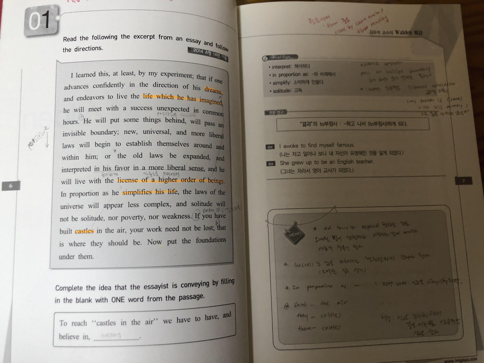 월든의 내용 예시입니다. 이와 같이 발췌문과 함께 다양한 유형의 문제가 있습니다. 각 문항마다 기입형, 서술형 등 다양한 유형의 문제가 있어서 지루하지 않아요. 그리고 중요한 표현 및 어휘는 왼쪽에 항상 기록되어 있습니다 :) 한가지 단점은 해설이 따로 있지 않아서 수업을 듣지 않으면 해석이나 정답을 확인하는 것이 어렵다는 점입니다