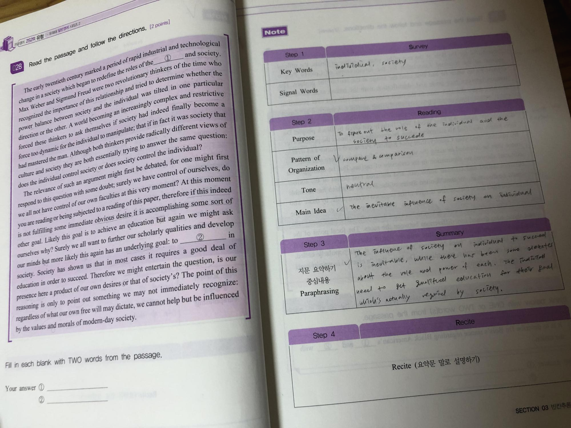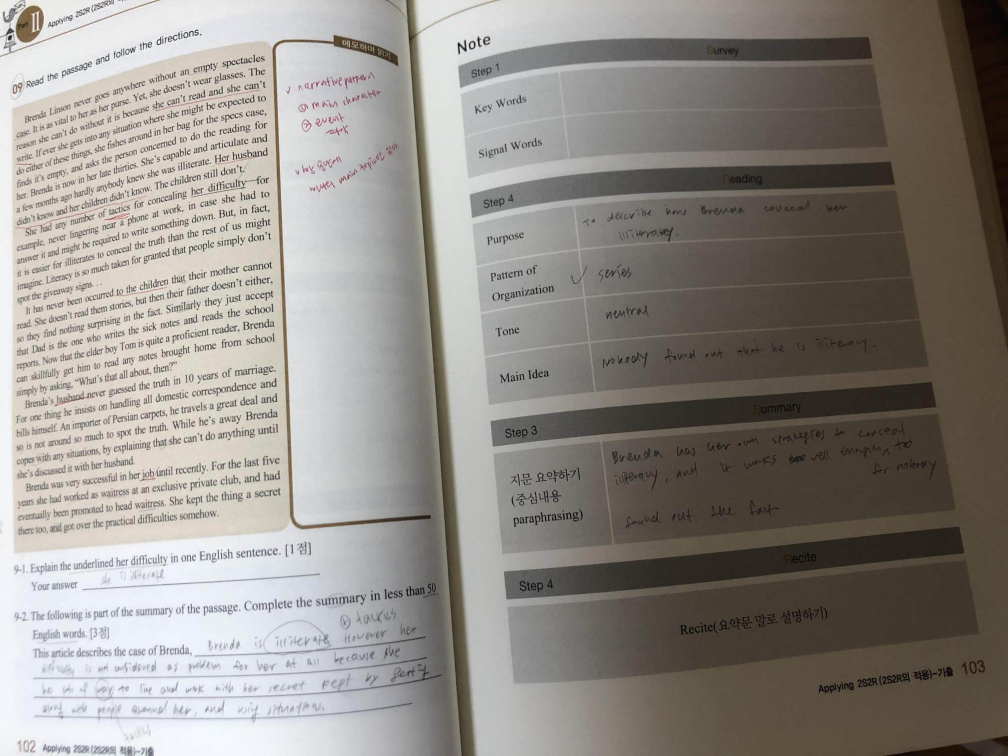 지문 내용은 위의 기출문제집과 비슷합니다. 왼쪽의 지문-오른쪽의 2S2R연습으로 되어있어서 일반영어 지문 분석 연습에 굿굿 2S2R연습을 하면 좋은 점은 문제도 풀고 플러스로 항상 메인 아이디어, 키워드, 요약을 해볼 수 있다는 점인 것 같아요 왜냐하면 '메인 아이디어, 키워드, 요약'은 기입형이나 서술형 모두에서 나오는 중요한 문제 유형이기 때문에 매 지문마다 연습하는 것이 중등 임용 일반영어 향상에 도움이 많이 될 것 같아요 :)