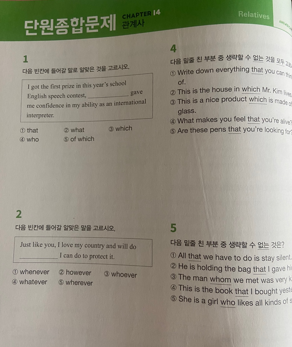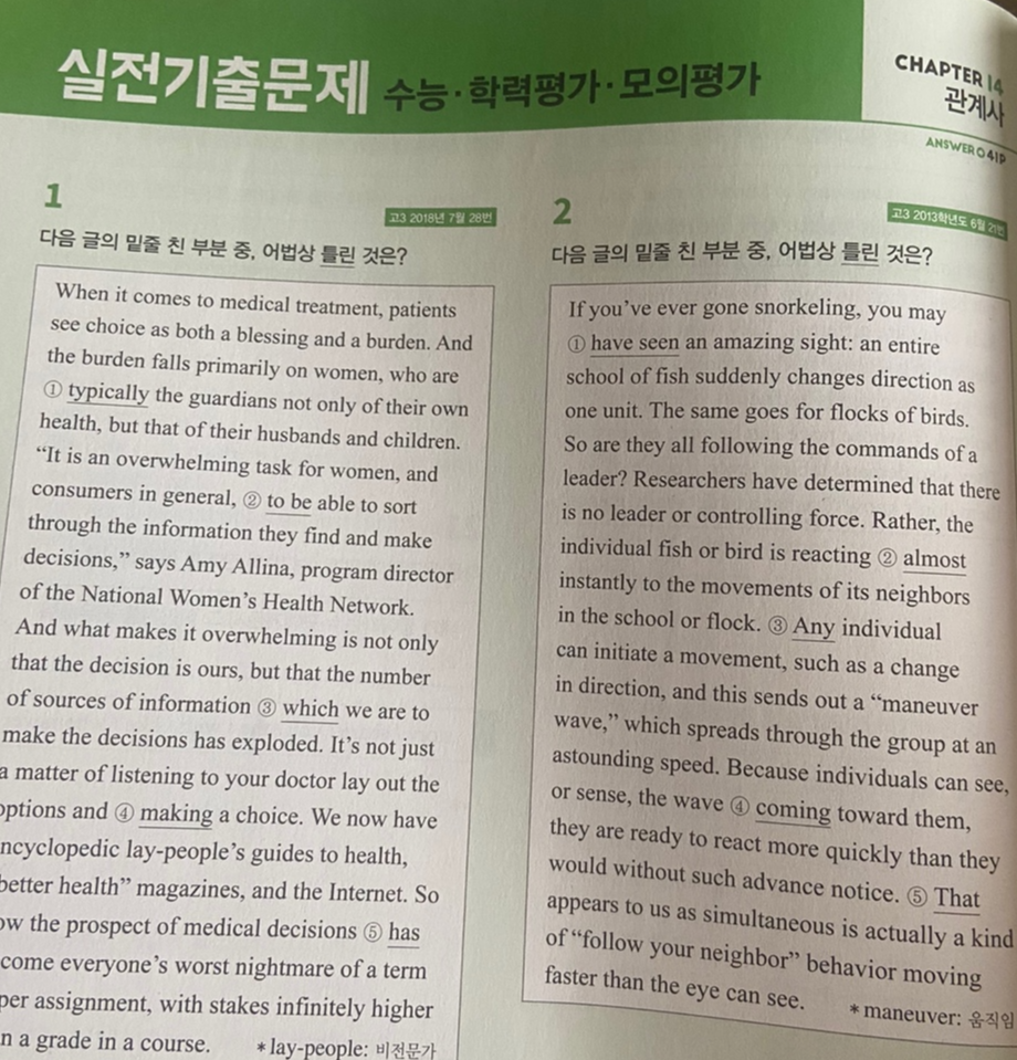 연습 문제 뒤에는 단원종합문제와 실전기출문제가 있어서 시험 문제 유형으로 연습을 할 수 있다. 그리고 실제 모의고사나 수능 기출로도 연습이 가능하다. 그래서 우리 나라 고등학생이 시험을 위한 영어 문법을 공부하기에 딱이다.