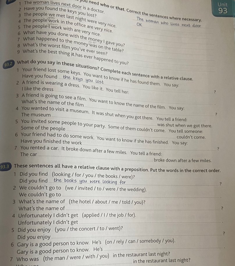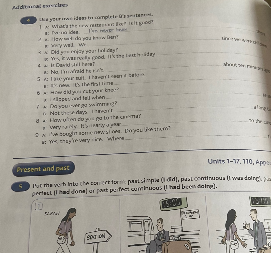 English Grammar in Use의 연습 문제 유형은 고교영문법 3300제와 비슷하다. 오른쪽에 문법 개념이 설명되어 있고, 왼쪽에 주관식 형식의 연습 문제가 있다.