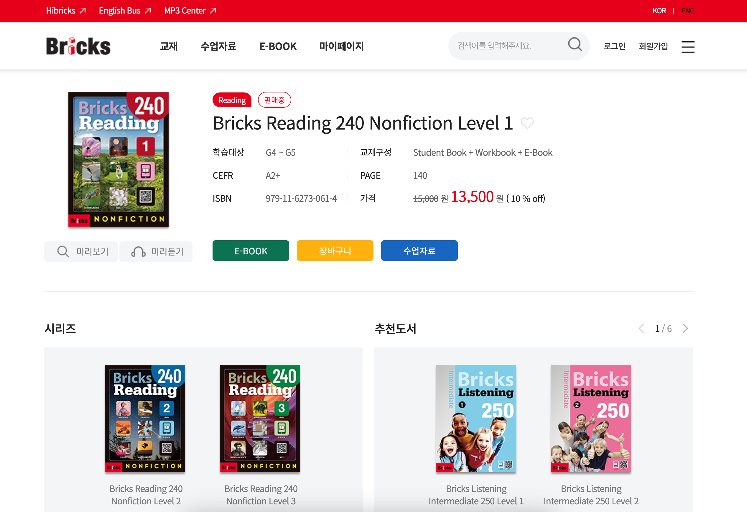 브릭스 리딩 240의 홈페이지에서 브릭스 리딩 240의 level1뿐만 아니라 2와 3에 대한 정보도 얻을 수 있다.