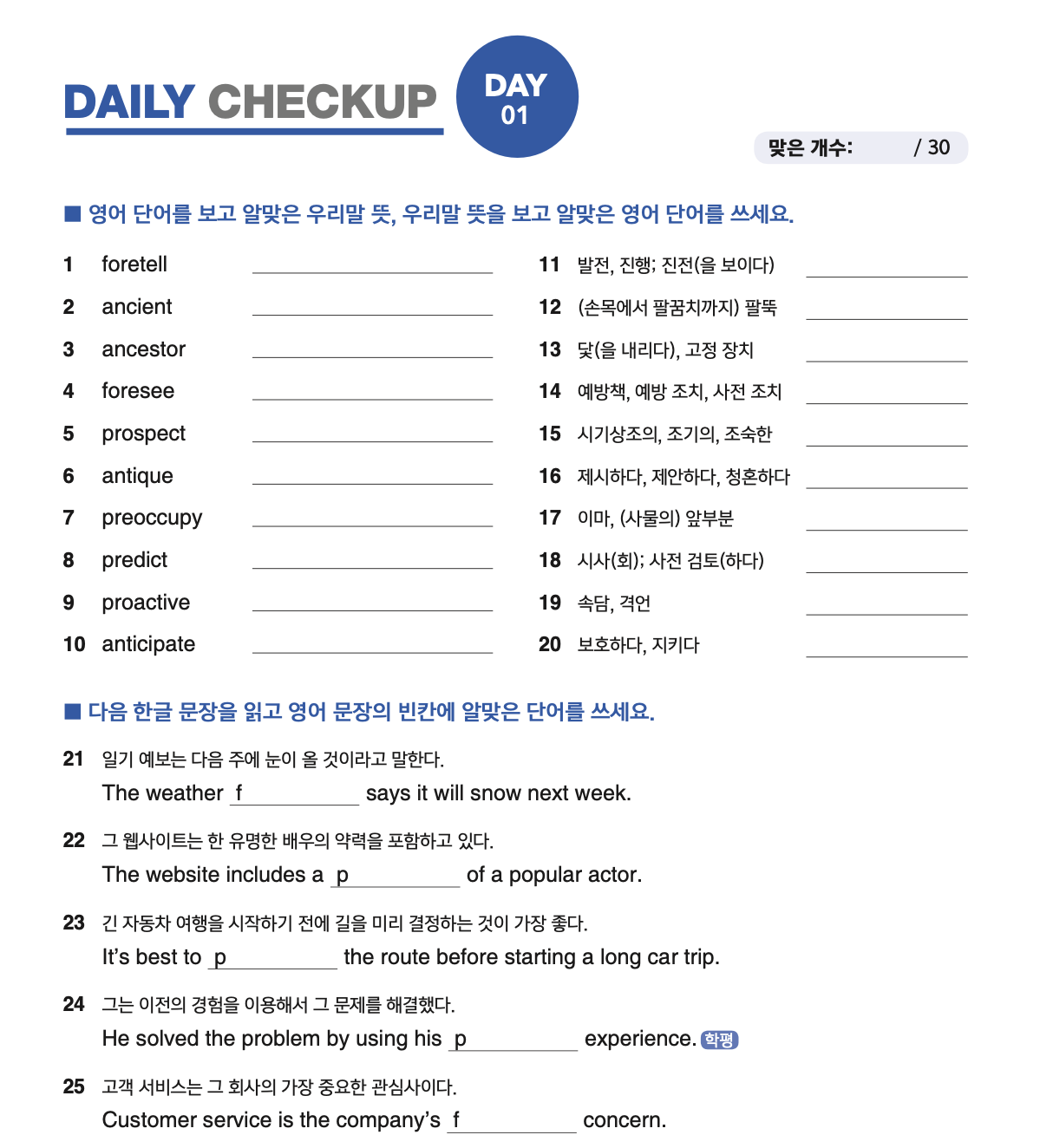 메인 단어 설명 바로 뒤 부분에 워크북이 붙어있는 단어장이 많은데, 개인적으로는 이렇게 메인북, 워크북, 미니북이 분리되어 있는 것이 참고 할 때 편하다