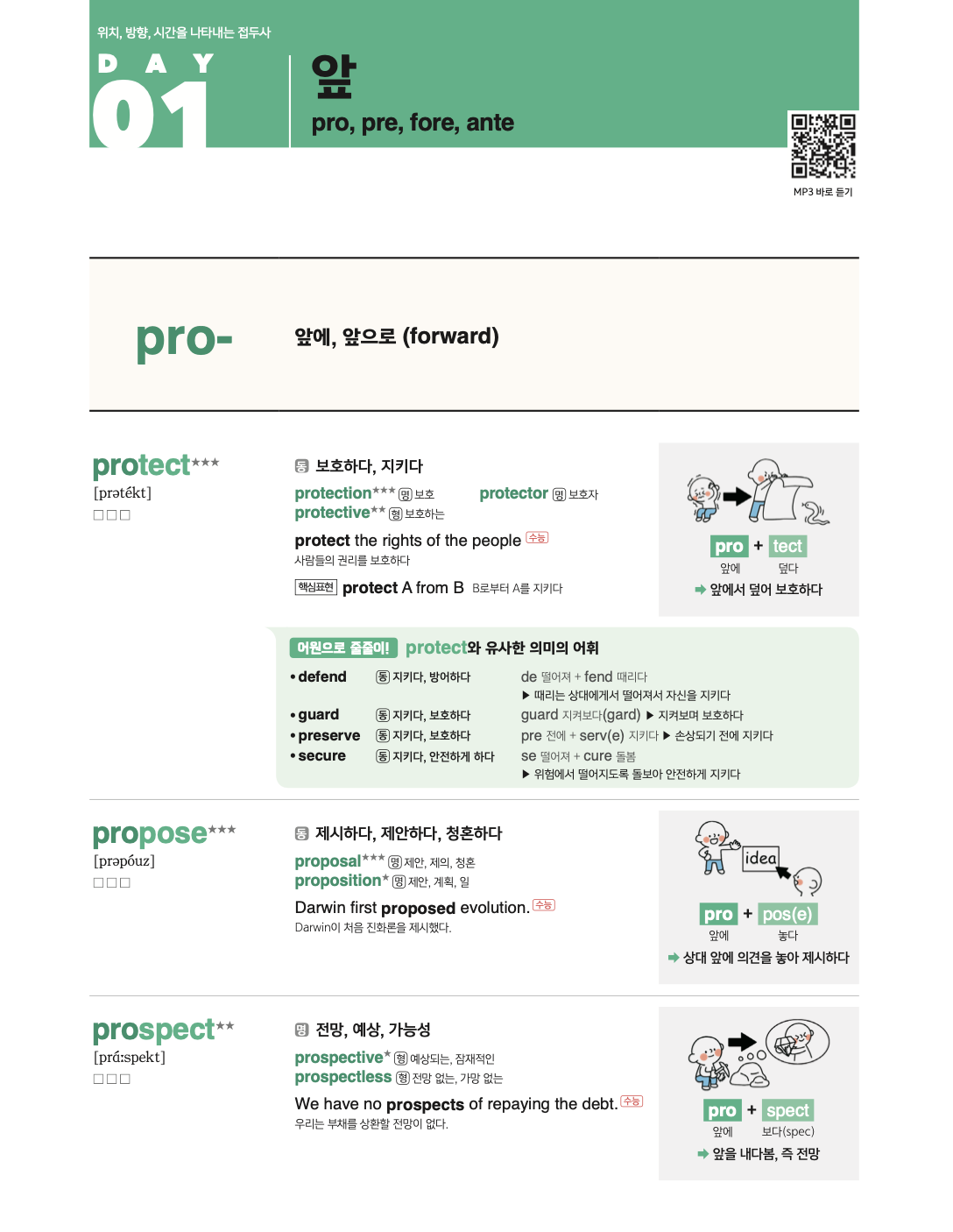 핵심 어원, 핵심 빈출 단어, 어원 설명(with 그림), 파생 표현, 수능 기출 예문, MP3파일이 있다.